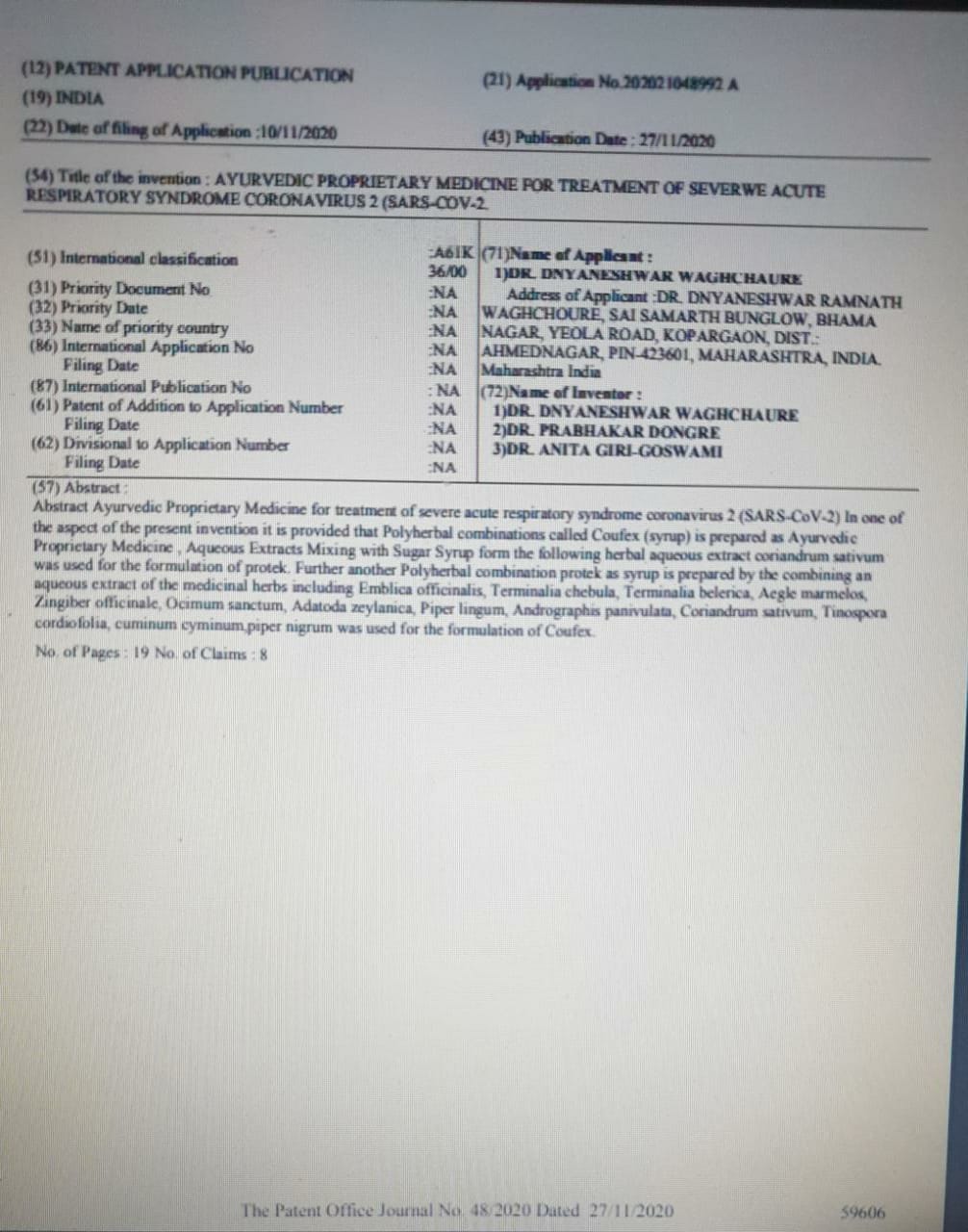 | 7 | Dr.Goswami -Giri Anita | AYURVEDIC PROPRIETARY MEDICINE FO TREATMENT OF SEVERE ACUTE RESPIRATORY SYNDROME CORONA VIRUS II (SARS-COV-2) | Application no- 202021048992 27/11/2020 | | More |
