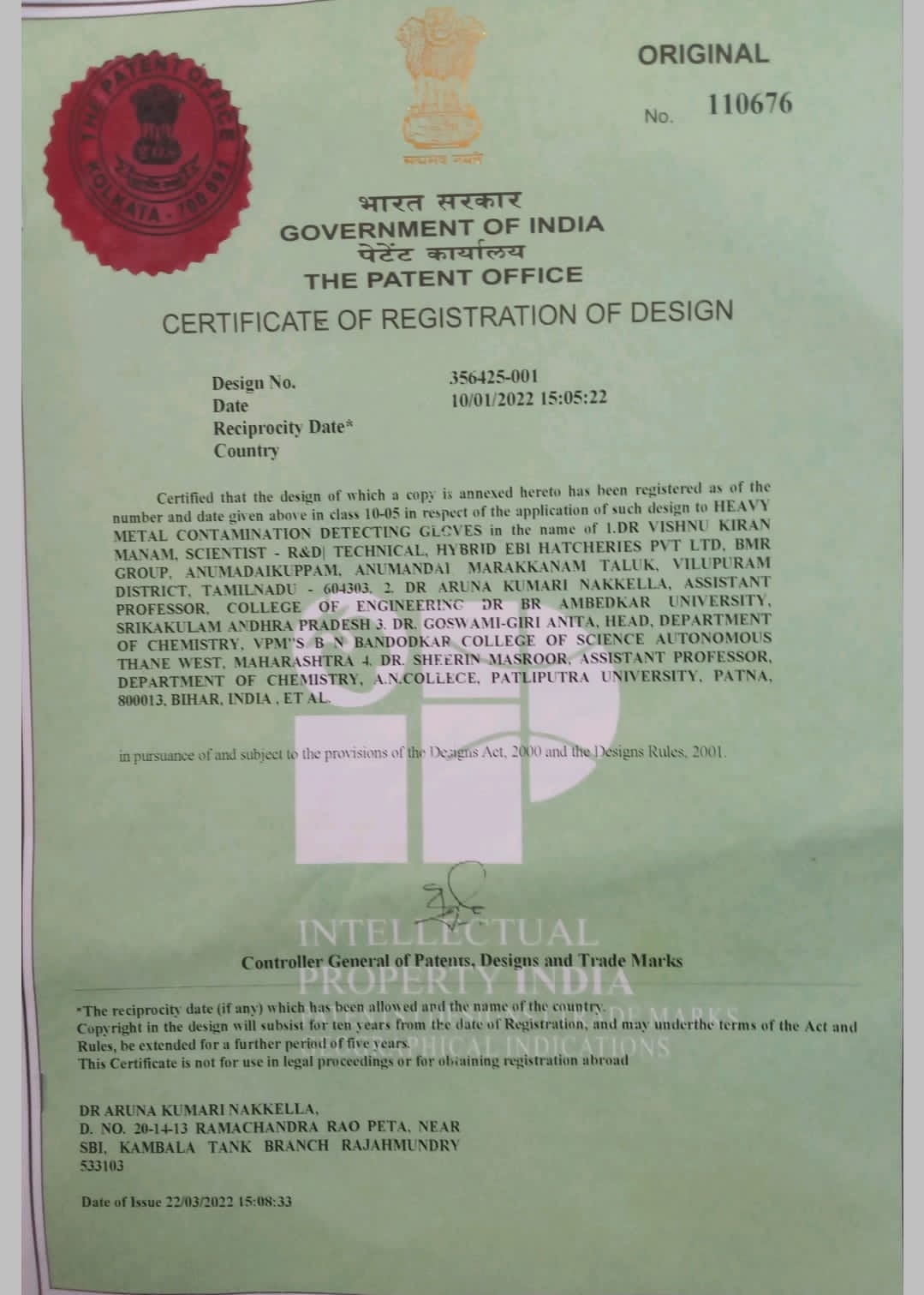 | 15 | Dr. A. S. Goswami-Giri | Portable Torch with air quality Tracking | IP desigend patent: 356423-001 Date: 18.03.2022 | | More |