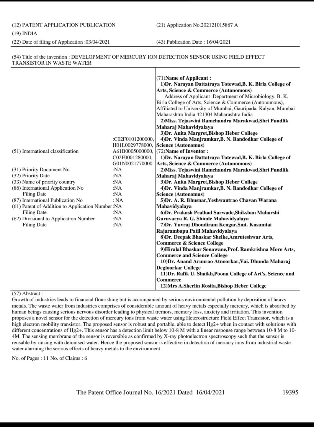 | 16 | Dr. Vinda Manjramkar | DEVELOPMENT OF MERCURY ION DETECTION SENSOR USING FIELD EFFECT TRANSISTOR IN WASTE WATER | IP 2021210158674 | | More |