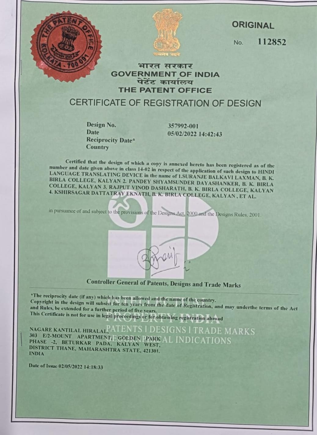 | 12 | Dr. Vinda Manjramkar | Hindi language translating device. | IP: 357992-001 | | More |